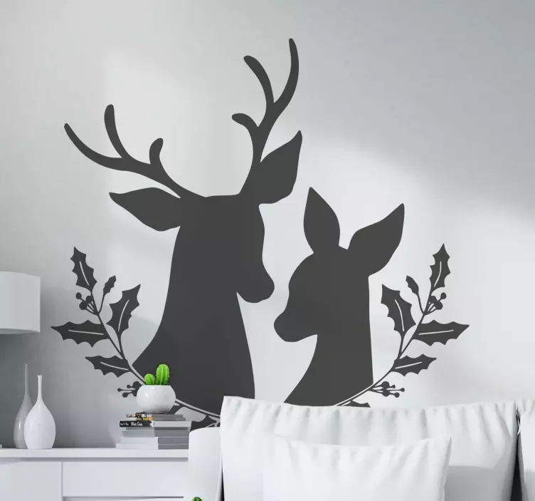 Referenz: A46840Eine charmante Darstellung von zwei Rehen mit kunstvollen Geweihen und sanften Ausdrücken, eingerahmt von Stechpalmenzweigen. Dieses Design vermittelt ein Gefühl von Wärme und Verbundenheit mit der Natur, perfekt um jeden Raum in eine ruhige und einladende Umgebung zu verwandeln.