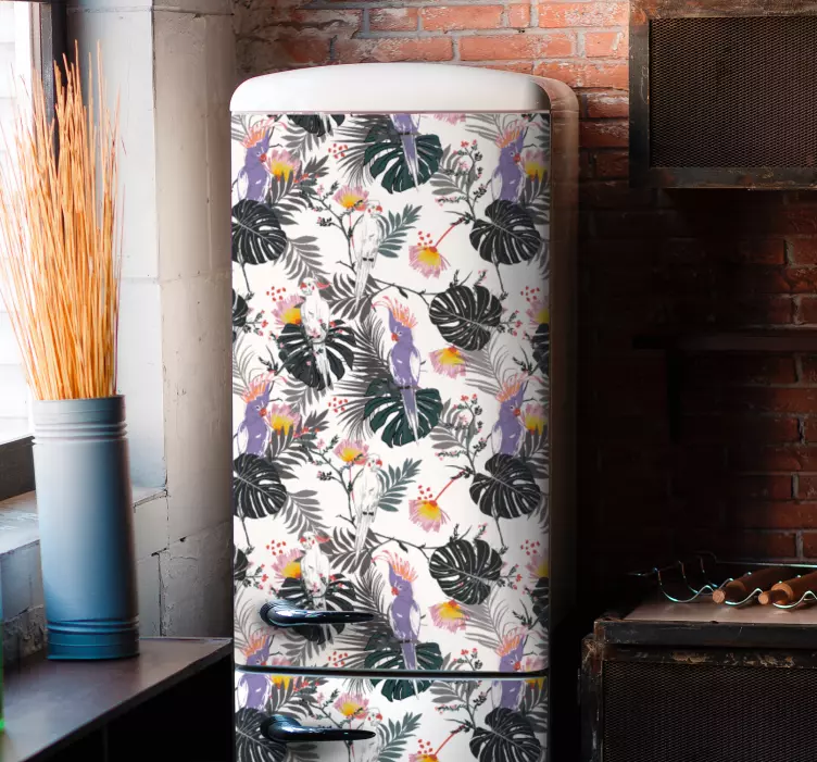Referenz: A53784Ein lebhaftes tropisches Blumenmuster mit Kakadus zwischen üppigen Blättern und bunten Blumen. Dieses Design bringt eine lebendige und exotische Note, perfekt um die Ästhetik jedes Raumes zu heben.