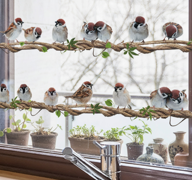 Fensteraufkleber mit haussperlingen auf zweigen