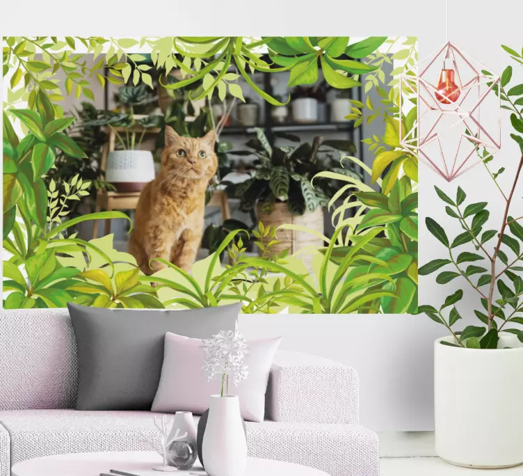 Referenz: A48313Eine charmante Szene mit einer aufmerksamen Katze, umgeben von üppigem Grün. Das Design fängt das Wesen der Natur ein, das mit dem Komfort des Zuhauses verwoben ist, und zeigt das neugierige Wesen der Katze zwischen einer Vielzahl von Zimmerpflanzen.