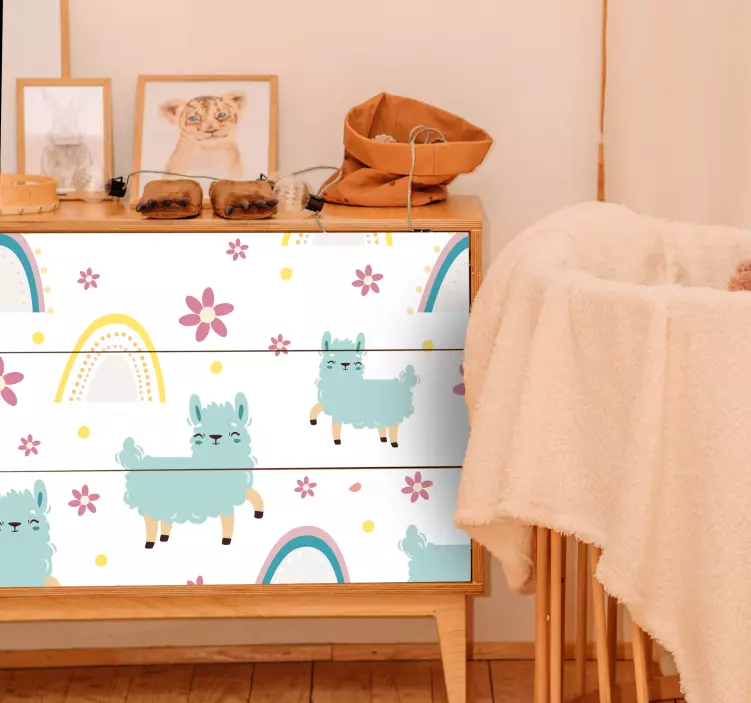 Entdecken Sie die bezaubernden Katzen Sticker mit charmantem lama konzept, die mit einem einzigartigen Design begeistern! Diese Aufkleber präsentieren eine verspielte Illustration von Lamas, die in bunten Regenbögen und floralen Mustern eingebettet sind. Die grafische Darstellung ist lebendig und zieht sofort alle Blicke auf sich. Ob auf Möbeln oder Wänden, diese Sticker verleihen jedem Raum eine fröhliche und einladende Atmosphäre!