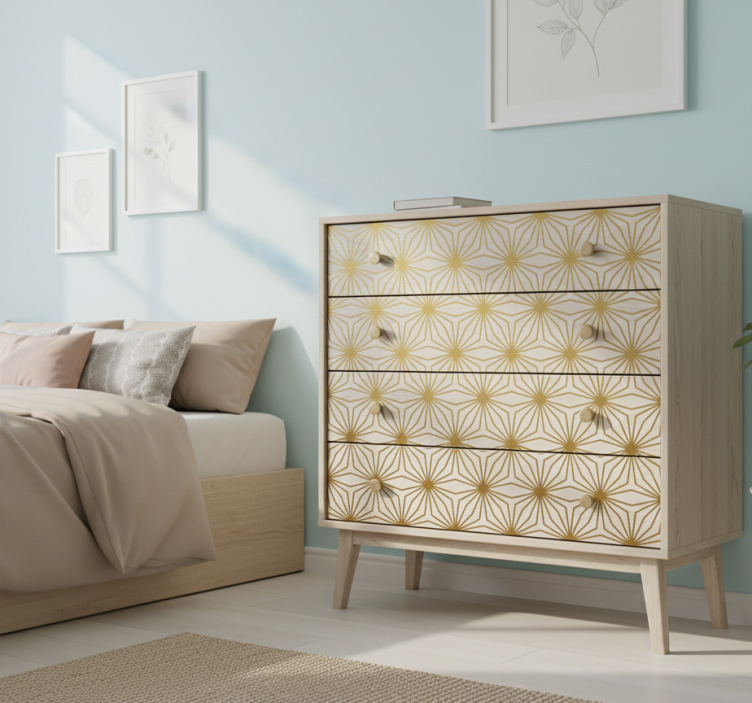 Referenz: A54878Entdecken Sie die zauberhafte Möbelfolie goldblumen geometrisches muster, die mit ihrem einzigartigen Design die Schönheit Ihrer Einrichtung auf ein neues Level hebt. Die harmonische Kombination aus goldenen Blüten und geometrischen Formen schafft eine elegante und zugleich moderne Atmosphäre in jedem Raum. Diese Folie überzeugt nicht nur durch ihre ästhetische Ausstrahlung, sondern auch durch ihre praktische Anwendbarkeit, die sowohl für Wände als auch für Möbel geeignet ist.