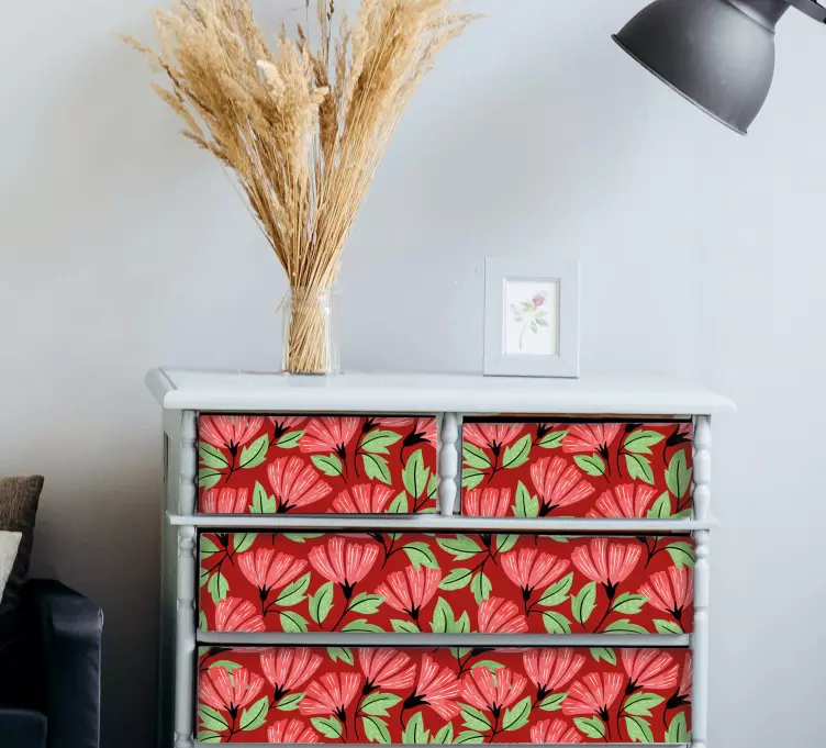 Entdecken Sie die Möbelfolie mit floraler grafiküberlagerung, die Ihr Zuhause mit einem Hauch von Natur verzaubert! Das Design besticht durch leuchtende Farben und kunstvoll gestaltete Blumen sowie zarte Blätter, die harmonisch miteinander verwoben sind. Diese Illustration bringt die Schönheit der Natur direkt in Ihr Wohnambiente und verleiht jedem Raum eine frische und lebendige Atmosphäre!
