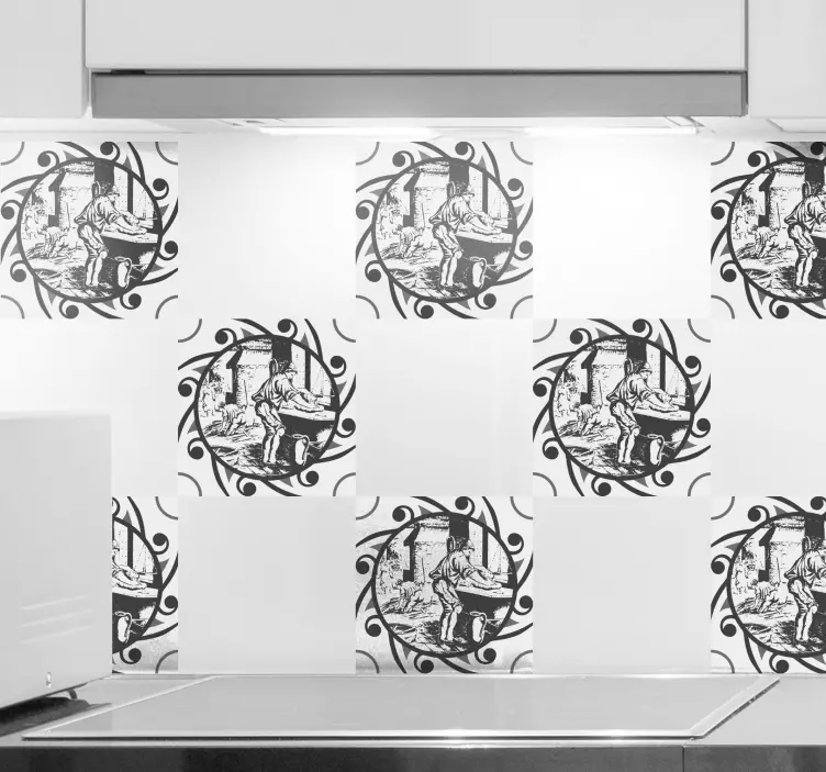 Entdecken Sie die faszinierende Welt der Objekt Aufkleber vintage bastelszene, die mit einem einzigartigen grafischen Design aufwartet. Die stilvolle Darstellung von Backen, einer Person, Fliesen und Gravuren in einem künstlerisch-abstrakten Schwarz-Weiß-Stil verleiht jedem Raum eine unverwechselbare Note. Diese Aufkleber sind die perfekte Wahl für kreative Bastler und Dekorationsliebhaber!