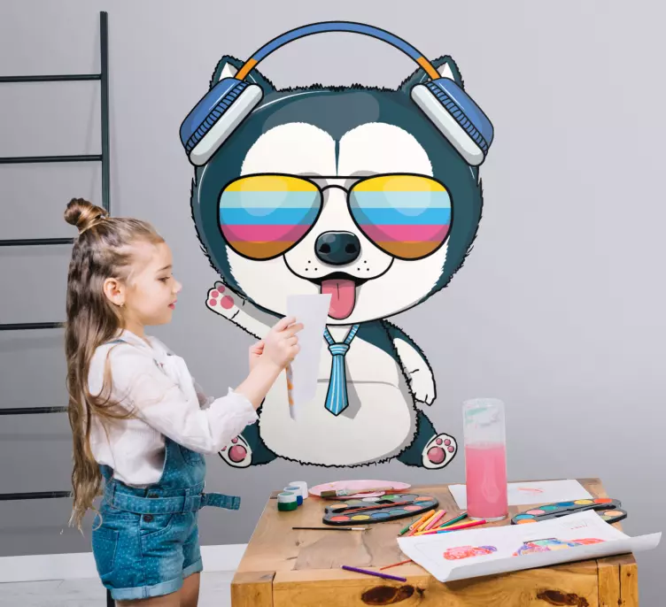 Entdecken Sie unser bezauberndes Wandtattoo Haustier coole Tierfigur, das Ihre Wände zum Leben erweckt! Dieses einzigartige Design zeigt einen Hund mit einem Welpen in Sonnenbrille und Kopfhörern, das in einer Karikatur gestaltet ist. Es strahlt niedliche und spielerische Vibes aus und bringt Farbenfrohheit und Musik in jeden Raum. Perfekt für Tierliebhaber und alle, die Spaß an kreativer Wandgestaltung haben!