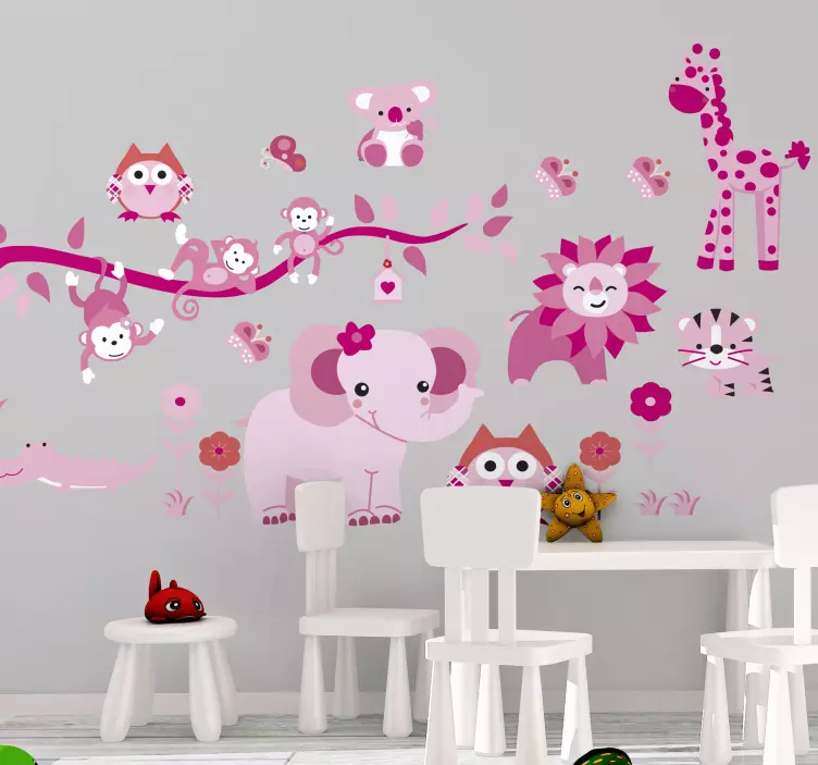 Bringen Sie zauberhafte Lebensfreude in das Kinderzimmer mit unserem Wandtattoo Kinderzimmer bezaubernde kreaturen sammlung. Dieses fesselnde Design zeigt eine bunte Sammlung von Tieren aus dem Dschungel, die in einem spielerischen und wunderlichen Karikaturstil gestaltet sind. Die sanften Rosa- und Grüntöne erzeugen eine harmonische Atmosphäre, die die Fantasie Ihrer Kinder anregt und das Zimmer in einen kreativen Urwald verwandelt. Jeder Blick auf diese lebendige Illustration wird ein Lächeln auf die Gesichter Ihrer Kleinen zaubern und das Ambiente des Raumes auf eine dekorative Weise aufwerten.