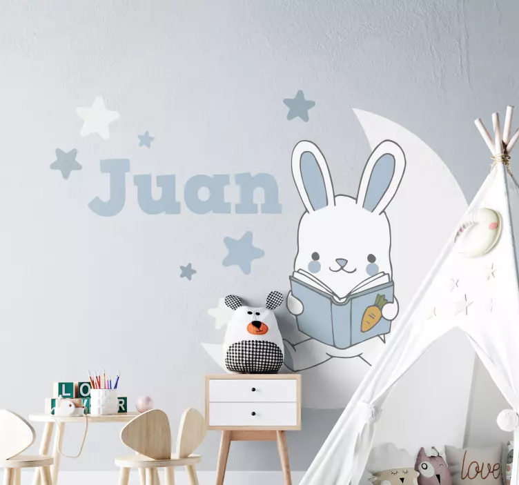 Referenz: A51047Ein verspieltes Design mit einem charmanten Bunny, das ein Buch liest, umgeben von Sternen und einem Halbmond. Perfekt zur Personalisierung des Kinderzimmers, ermutigt dieses spielerische Thema junge Leser und verleiht dem Raum einen Hauch von Magie.