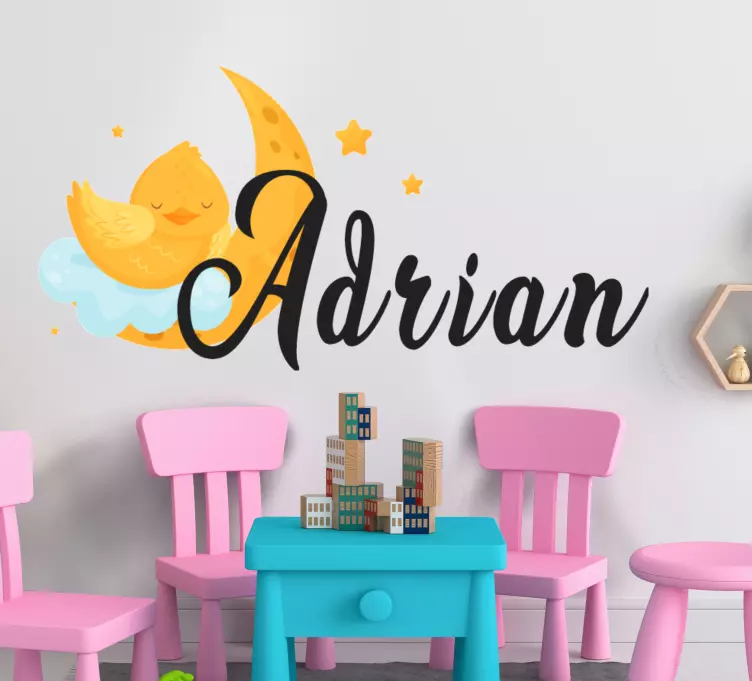Referenz: A48928Eine verspielte Mondillustration zeigt einen fröhlichen Vogel, der auf Wolken ruht, umgeben von lebhaften Sternen. Dieses Design verleiht Kinderbereichen eine fantasievolle Note und lädt zu Freude und Kreativität ein. Es ermöglicht eine Anpassung für eine verstärkte persönliche Verbindung und ist somit perfekt für ein Kinderzimmer oder Spielzimmer.