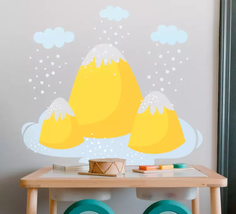 Das Wandtattoo Natur gelbe Berggipfel begeistert mit einem strahlenden Gelb, das die majestätischen Berge in einer einzigartigen Illustration zur Geltung bringt. Umgeben von sanften Wolken und glitzerndem Schnee entfaltet sich ein wunderliches Naturszenario, das jeden Raum in ein harmonisches und inspirierendes Ambiente verwandelt. Lassen Sie sich von der Schönheit der Natur verzaubern und schaffen Sie eine Atmosphäre, die zum Träumen einlädt!