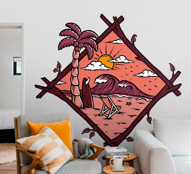 Tauchen Sie ein in ein Wandtattoo natur tropische strandlandschaft, das Ihnen die Ruhe und Gelassenheit eines einsamen Strandes vermittelt. Mit einem Surfer, der die sanften Wellen reitet, einem atemberaubenden Sonnenuntergang im Hintergrund, Palmen, die sanft im Wind wiegen, und einem gemütlichen Strandstuhl, der zur Entspannung einlädt, bringt dieses Design die tropische Atmosphäre direkt in Ihr Zuhause. Die majestätischen Berge im Hintergrund vervollständigen das Bild und schaffen eine harmonische Verbindung zur Natur.