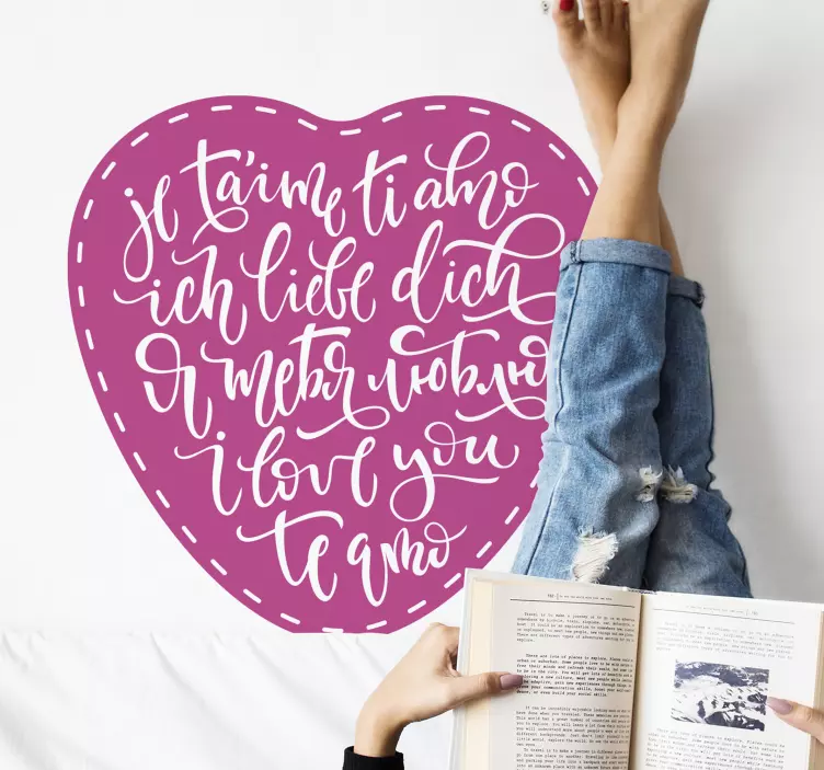 Unser Wandtattoo Rezept herzliches liebesausdrücken ist eine wunderschöne Kombination aus grafischem Design und emotionalen Ausdrucksformen. Die Darstellung umfasst ein stilvolles Herz mit einem kalligraphischen Text, der in verschiedenen Sprachen die Botschaft der Liebe vermittelt. Dieses mehrsprachige Wandtattoo ist nicht nur dekorativ, sondern auch eine tiefgreifende emotionale Hommage an die Liebe und sorgt für eine individuelle Note in Ihrem Zuhause.