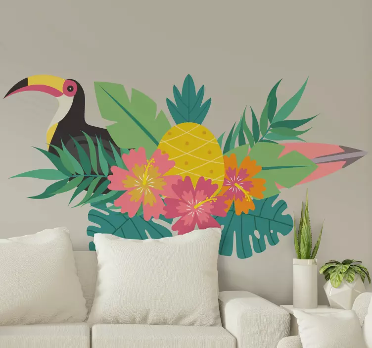 Bringen Sie mit unserem Wandtattoo Tiere im tropischen Vogel Design einen Hauch von Exotik in Ihr Zuhause! Dieses lebendige Design besticht durch die bunten Farben eines Tukan, umgeben von tropischen Blättern, saftigen Ananas und blühenden Blumen. Die leuchtenden Farbtöne in Grün und anderen kräftigen Farben sorgen dafür, dass Ihr Raum in einem neuen Licht erstrahlt und eine fröhliche Atmosphäre schafft.