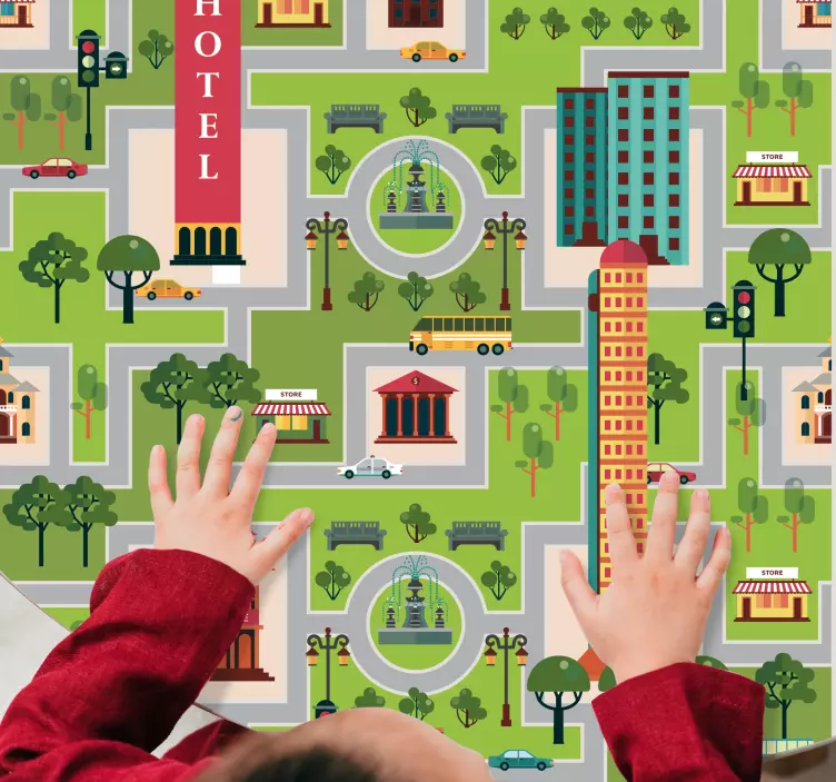 Referenz: A49463Eine lebendige Stadtkarte mit komplexen Details wie Gebäuden, Bäumen, Geschäften und Fahrzeugen. Sie zeigt verschiedene Wahrzeichen, einschließlich eines Hotels und eines Brunnens, und regt zum fantasievollen Spielen und Erkunden für Kinder an, wodurch ein fesselndes und interaktives Erlebnis entsteht.