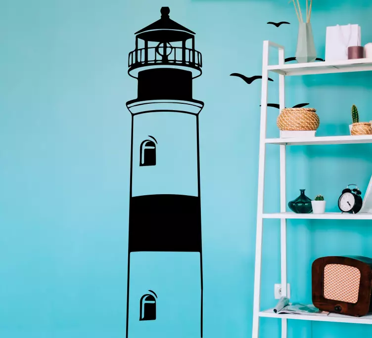 Verleihen Sie Ihrem Wohnraum mit unserem Wandtattoo Welt Leuchtturm Silhouette eine maritime Note! Dieses beeindruckende Design zeigt einen stilisierten Leuchtturm, umgeben von Vögeln und einer wunderschönen Silhouette, die sofort Erinnerungen an küstennahe Abenteuer weckt. Die nautischen Elemente schaffen eine entspannte Atmosphäre und bringen die Natur in Ihr Zuhause, ideal für Liebhaber der Küsten und des Meeres.