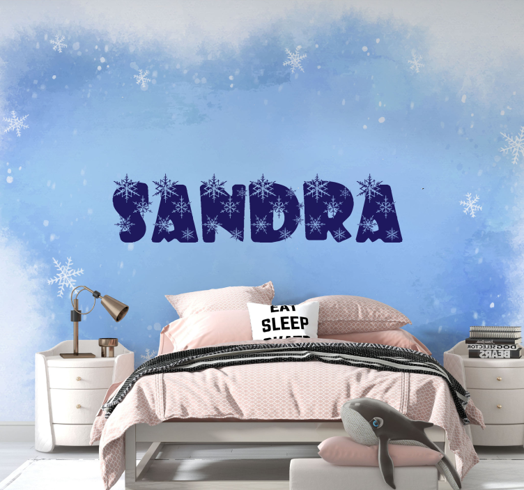 Referenz: F8575Ein charmantes Design mit dem Namen in fetten Buchstaben, verziert mit Schneeflocken auf einem sanften blauen Hintergrund. Dieses anpassbare Stück fügt eine persönliche Note hinzu und ist perfekt für einen verspielten Akzent in einer ruhigen Umgebung.