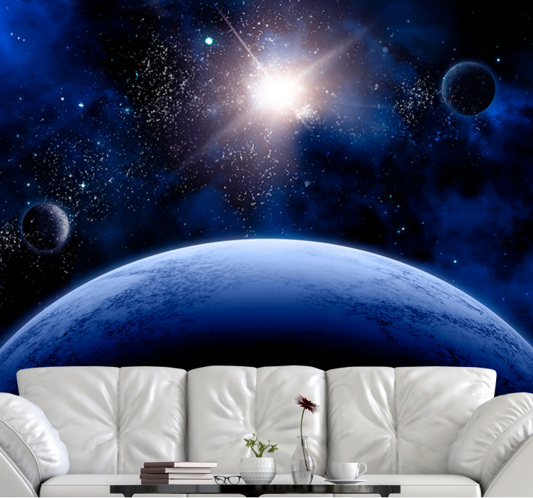 Entdecken Sie die faszinierende Fototapete Weltraum himmlische orbitalperspektive, die Ihnen ein einzigartiges und traumhaftes Erlebnis in Ihre eigenen vier Wände bringt. Diese atemberaubende Tapete zeigt eine beeindruckende Darstellung von Planeten, einem strahlenden Platz, funkelnden Sternen sowie der Sonne, die mit ihrem Licht die Galaxis erhellt. Das Design ist in matten Farben gehalten und vermittelt das Gefühl, als würden Sie durch das Universum reisen.