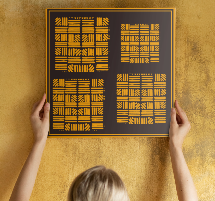 Entdecken Sie die faszinierende Welt der Wandbilder modern geometrisches anordnungskonzept, die mit einem einzigartigen Design bestechen. Dieses Kunstwerk kombiniert afrikanische Muster mit goldenen und gelben Akzenten, die durch harmonische Linien und Formen zum Leben erweckt werden. Die abstrakte Gestaltung bringt eine moderne Note in Ihr Zuhause und verwandelt jeden Raum in einen stilvollen Rückzugsort. Jedes Bild ist gerahmt und wird mit einem passenden Bilderrahmen geliefert, um die geometrischen Elemente und das Netzdesign perfekt zu betonen.