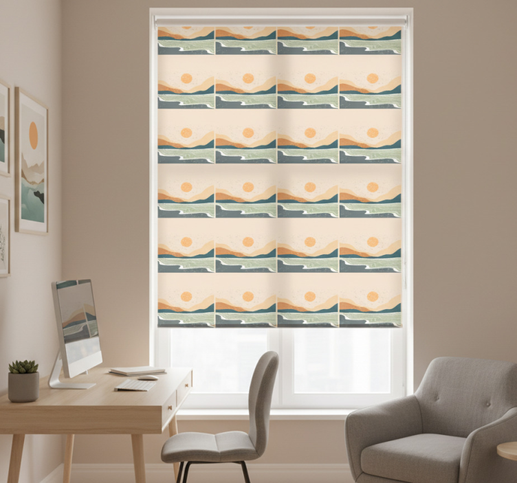 Referenz: E6216Entdecken Sie das Rollo Fenster Büro abstrakte Sonnenuntergang Berge, das mit einem atemberaubenden Design begeistert. Die harmonischen Farben und die stilisierten Bergsilhouetten verleihen jedem Raum eine kreative Note und schaffen eine entspannende Atmosphäre. Dieses Rollo bietet nicht nur eine visuelle Bereicherung, sondern erfüllt auch praktische Funktionen wie den Schutz vor direkter Sonneneinstrahlung und die Regulierung der Raumtemperatur.