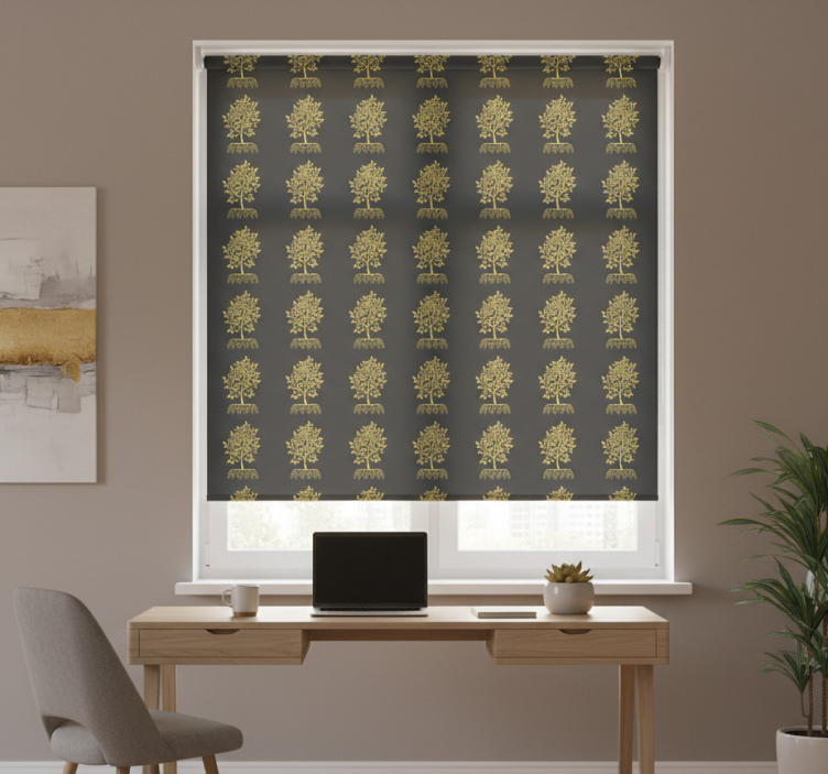 Referenz: E6213Erleben Sie das außergewöhnliche Design unseres Rollo Fenster Büro mit goldenem Baum-Motiv, das Ihre Büro- oder Wohnräume in ein elegantes Licht taucht. Das kunstvolle Baum-Motiv verleiht jedem Raum eine harmonische Atmosphäre und schafft eine einladende Umgebung zum Arbeiten und Entspannen. Dieses Rollo bietet nicht nur eine stilvolle Optik, sondern auch praktische Funktionen. Es schützt vor direkter Sonneneinstrahlung und sorgt gleichzeitig für Privatsphäre, während Sie die Regulierung der Raumtemperatur ganz nach Ihren Wünschen vornehmen können.