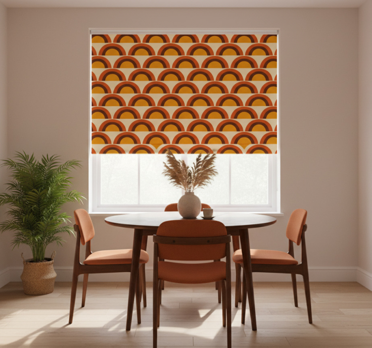 Das Rollo Fenster Gelb 70er jahre sonnenuntergang bögen ist die perfekte Wahl für alle, die ihrem Raum eine einladende und fröhliche Note verleihen möchten! Dieses dekorative Produkt schützt nicht nur vor direkter Sonneneinstrahlung, sondern bietet auch Privatsphäre im abgesenkten Zustand. Es ermöglicht Ihnen, die Raumtemperatur zu regulieren und verbessert die gesamte Raumdekoration. Die einfache Montage und Demontage in nur 2 Klicks machen es zudem äußerst benutzerfreundlich. Lassen Sie Ihr Zuhause erstrahlen und genießen Sie den Charme der 70er Jahre!