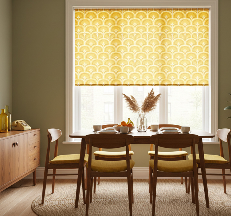 Rollo fenster gelb mit retro figuren aus den 70ern