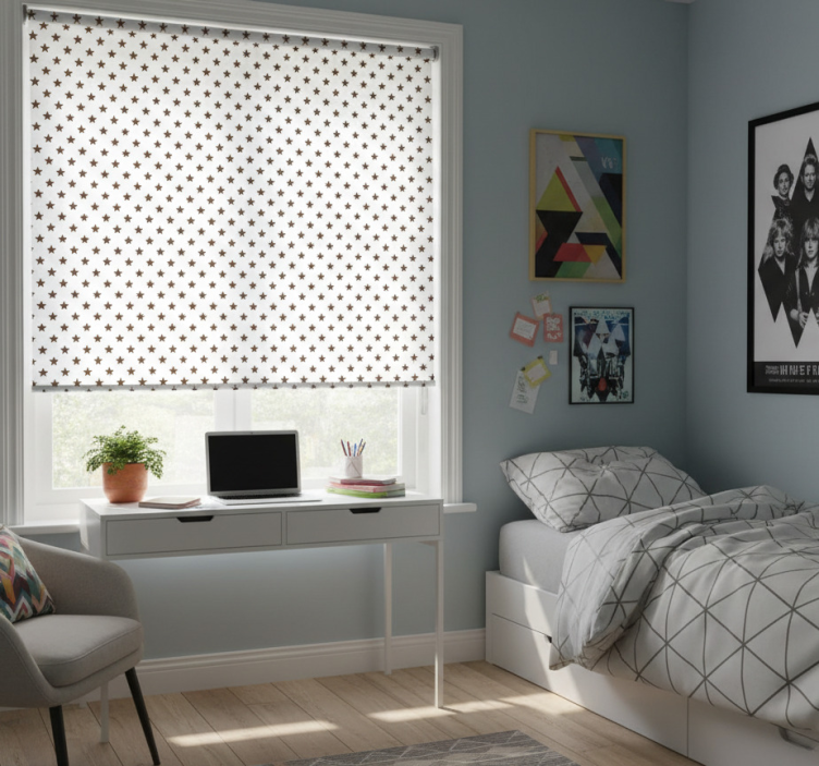 Referenz: E7542Das Rollo Fenster Jugendzimmer mit braunen Sternen ist ein wahres Highlight für jeden Raum. Mit seinem einzigartigen Design bringt es eine harmonische Atmosphäre, die sowohl beruhigend als auch inspirierend wirkt. Die braunen Sterne auf einem sanften Hintergrund schaffen eine gemütliche und einladende Umgebung, die ideal für kreative Köpfe und junge Träumer ist. Dieses dekorative Element verbindet Funktionalität mit einem charmanten Aussehen und verwandelt jedes Jugendzimmer in einen Ort des Wohlbefindens!