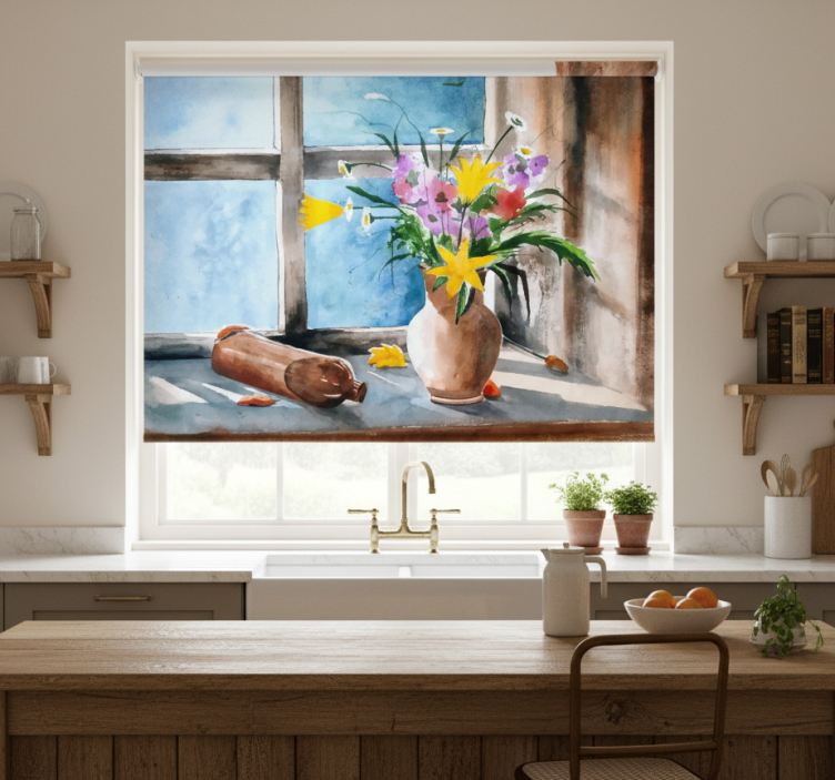 Rollo fenster küche im vintage pflanzen design