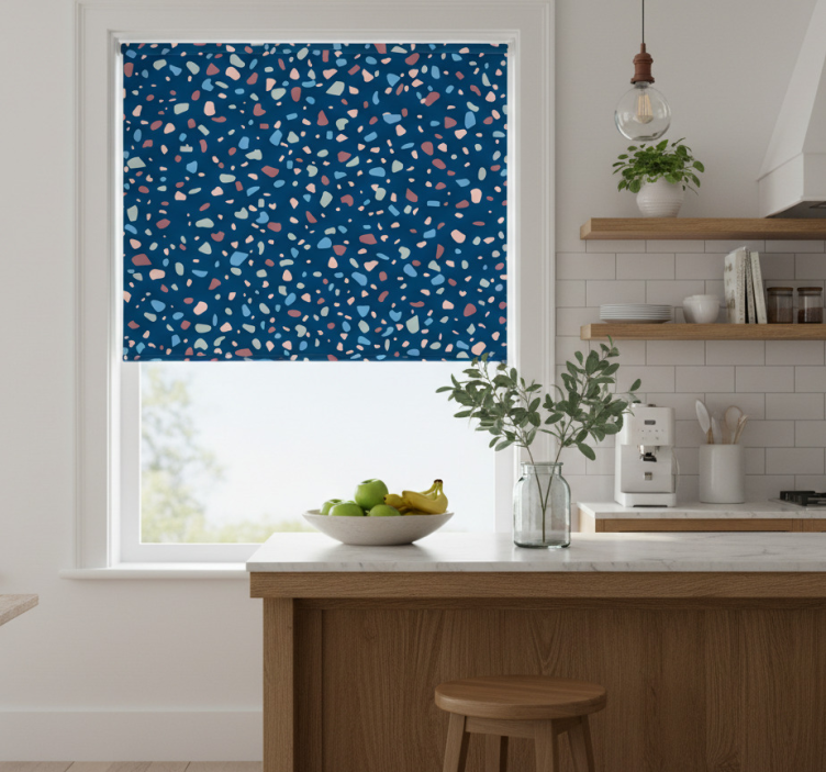 Referenz: E6435Entdecken Sie das Rollo Fenster Küche in dunkelblauem terrazzo, das mit seinem einzigartigen Design Ihre Küche in ein stilvolles Ambiente verwandelt. Die harmonische Kombination aus tiefblauem Terrazzo-Muster verleiht Ihrem Raum eine elegante Note. Dieses dekorative Rollo ist nicht nur ein Blickfang, sondern bietet auch praktische Funktionen. Es schützt Ihren Raum vor direkter Sonneneinstrahlung und ermöglicht Ihnen, die Lichtverhältnisse mühelos zu regulieren. Zudem sorgt es für die nötige Privatsphäre im abgesenkten Zustand und trägt zur Sicherheit Ihres Zuhauses bei, indem es Ihnen erlaubt, zu sehen, ohne gesehen zu werden.