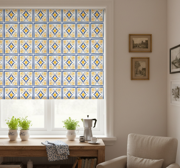 Das Rollo Fenster Küche mit blau-gelben portugiesischen Fliesen ist nicht nur ein dekoratives Element, sondern auch eine praktische Lösung für Ihre Fenstergestaltung. Es verleiht Ihrer Küche einen einzigartigen Charakter und lässt den Raum freundlich und hell erscheinen. Genießen Sie die Vorteile einer effektiven Sonnenschutzlösung, die gleichzeitig für eine angenehme Atmosphäre sorgt. Bei abgedunkeltem Zustand schützt es Ihre Privatsphäre und ermöglicht es Ihnen, das Licht nach Ihren Wünschen zu regulieren. Lassen Sie sich von diesem stilvollen Rollo inspirieren und verwandeln Sie Ihre Küche in einen Ort, an dem Sie gerne Zeit verbringen!