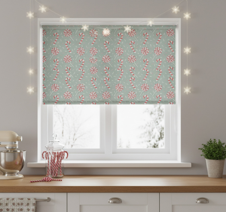 Referenz: E6388Entdecken Sie das bezaubernde Rollo Fenster Küche rote Weihnachtsbonbons, das mit seinen festlichen Mustern und lebendigen Farben jedem Raum in Ihrem Zuhause eine fröhliche Atmosphäre verleiht. Die grafische Gestaltung zeigt eine Vielzahl von roten Weihnachtsbonbons, die auf einem sanften Hintergrund erstrahlen und somit einen perfekten Akzent in Ihrer Küche setzen. Mit einer einfachen Montage, die nur zwei Klicks erfordert, können Sie dieses dekorative Element schnell anbringen und genießen!
