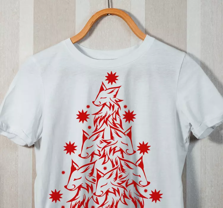 Referenz: T5438Dieses einzigartige festliche Design zeigt kunstvoll angeordnete Wolfsköpfe in einer Pyramidformation, ergänzt durch Sternmotive. Die lebendige rote Farbe hebt sich vor dem weißen Hintergrund ab und macht es zu einem auffälligen Stück, das perfekt für die Feiert season ist.