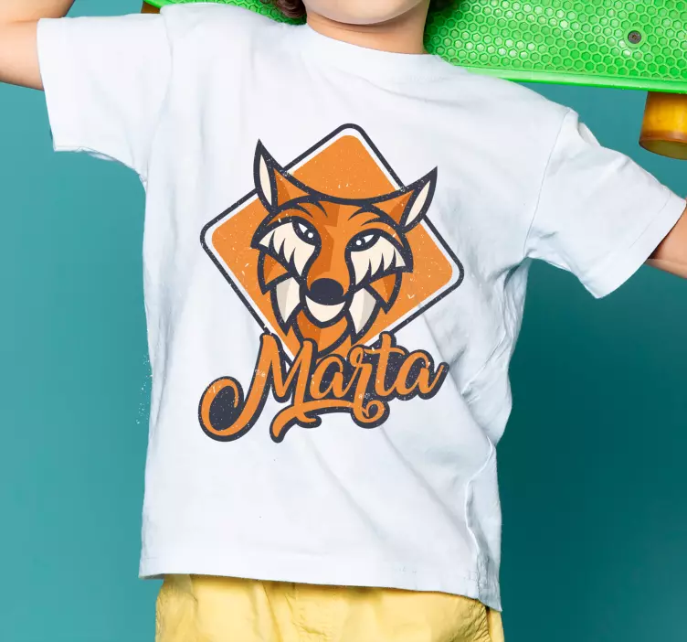 Referenz: T4980Dieses fesselnde Design zeigt eine auffällige Fuchs-Illustration mit kräftigen Farben und verspielten Elementen, personalisiert mit dem Namen 'Marta'. Perfekt für Kinder, vereint es Spaß und Kreativität und macht jedes Stück einzigartig und besonders.