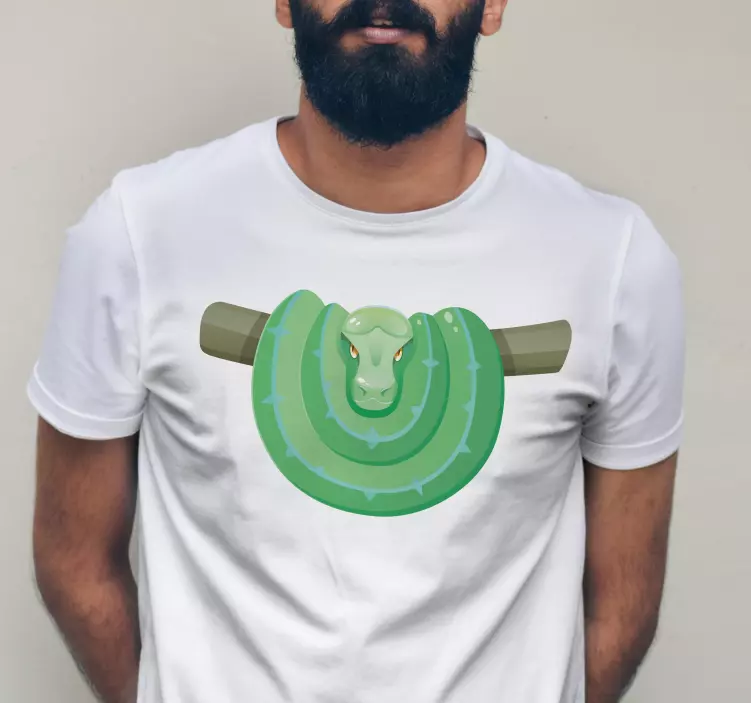 Entdecken Sie unser Original T Shirt im grünen schlangendesign, das mit einer einzigartigen grafischen Darstellung begeistert. Die stilvolle Illustration zeigt eine Boa, die sich elegant um einen Zweig windet. Die Karikatur der Schlange in lebhaftem Grün verleiht dem Shirt einen lässigen und gleichzeitig einzigartigen Look, der jeden Outfit aufwertet!