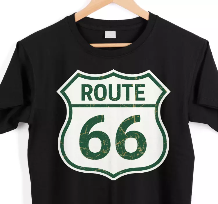 Referenz: T4636Dieses Design zeigt ein klassisches Route 66 Emblem, das ein Gefühl von Nostalgie und Abenteuer weckt. Die Vintage-Ästhetik verkörpert den Geist des Reisens mit ihrem abgenutzten Look und macht es perfekt für Enthusiasten ikonischer amerikanischer Straßen.