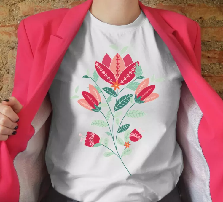 Entdecken Sie unser Original T Shirt mit floralem blumenarrangement, das mit einem atemberaubenden handgemalten Design begeistert. Die bunten Blumen und folkloristischen Motive schöpfen aus der Schönheit der Natur und bringen den Frühling direkt in Ihren Kleiderschrank. Jedes T-Shirt ist ein einzigartiges Kunstwerk, das Tradition und modernen Stil vereint und perfekt für alle ist, die die beschwingte Leichtigkeit des Lebens lieben!