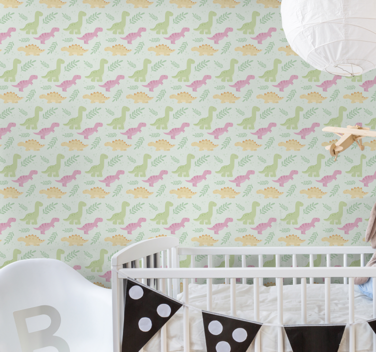 Referenz: P6439Ein bezauberndes Muster mit verspielten Dinosauriern in Pastelltönen, ideal für den Raum eines Kindes. Dieses Design integriert niedliche Dinosaurier, die eine sanfte, einladende Atmosphäre für die Entwicklung von fantasievollen Köpfen schaffen.