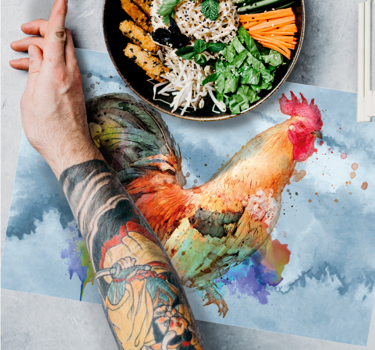 Sie möchten Ihren Tischen etwas Farbe und Leben verleihen? Dann werfen Sie einen Blick auf dieses erstaunliche Aquarell-Hahn-Tischset und machen Sie Ihre Mahlzeiten einzigartig. Der handgemalte Hahn über einem blauen Aquarellhintergrund verleiht Ihrem Tisch das gewisse Etwas.