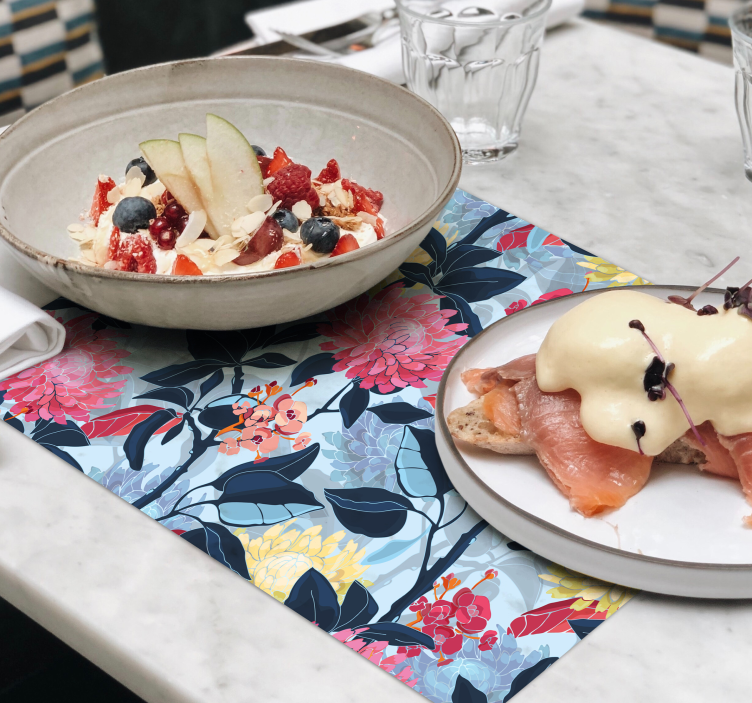 Entdecken Sie die originelle Eleganz unserer Tischsets originell mit floraler mustereleganz, die mit einem lebendigen Blumenmuster verziert sind. Dieses Design vereint beschwingte Farben und abstrakte Texturen, die Ihrer Tischdekoration einen fröhlichen und einladenden Charakter verleihen. Die bunten Blumen bringen frischen Schwung in jeden Raum und machen jedes Essen zu einem besonderen Erlebnis.